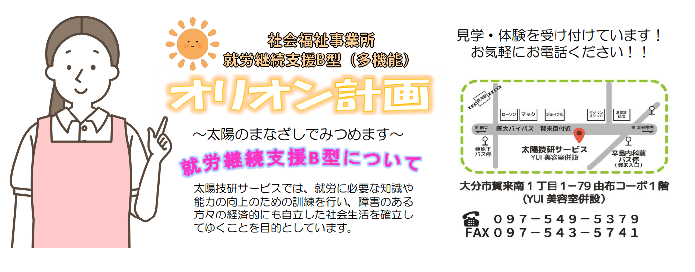 B型事業所について 2023.11.27 B型事業所について くわしく見る 利用者募集 応募条件 身体障がい者手帳・療育手帳・精神障がい保健福祉手帳・医師の意見書をお持ちの方。 それらがなくても働きたいと考えている方。 18歳~65歳までの方など。 電話で見学を予約する