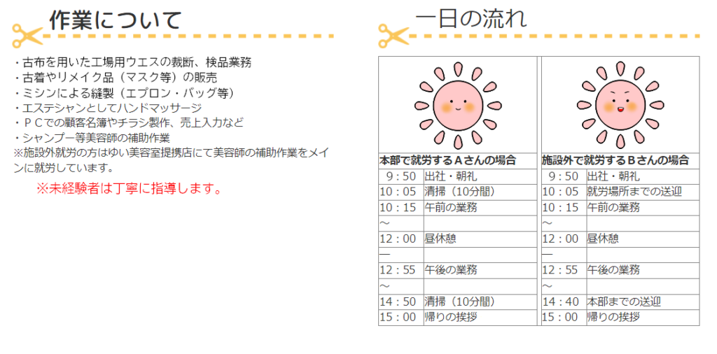 事業内容 2023.11.132023.11.17 事業内容 目標をもって働く 今すぐ一般企業に就労することが困難な方へ向けて、雇用契約に基づく労働・生産活動の機会を提供いたします。個々人の目標に向けた能力向上のため必要な訓練を行います。 097-549-5379