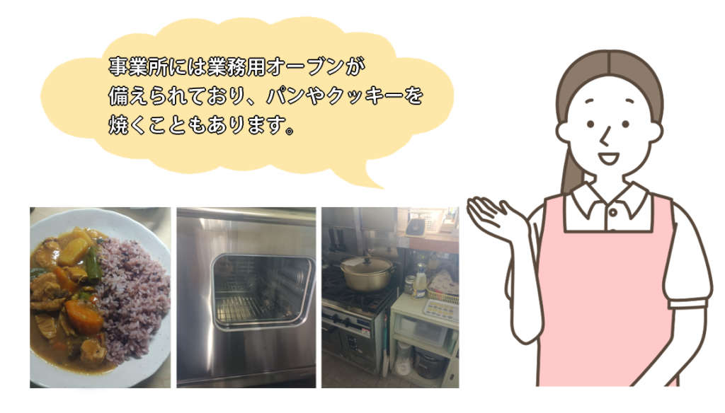 事業所には広いキッチンがあり、そこで準備をすることもあります。
